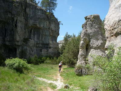 Pedaleamos por praderas flanqueadas por paredones calizos que están plagados de simas, atravesamos el río mil veces, avanzamos por cauces pedregosos y lechos arenosos, cuando no por sinuosas sendas entre pinos. ¡El catálogo de terrenos no se hace monótono, por